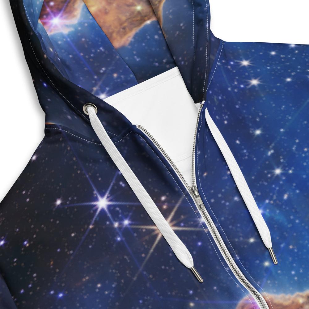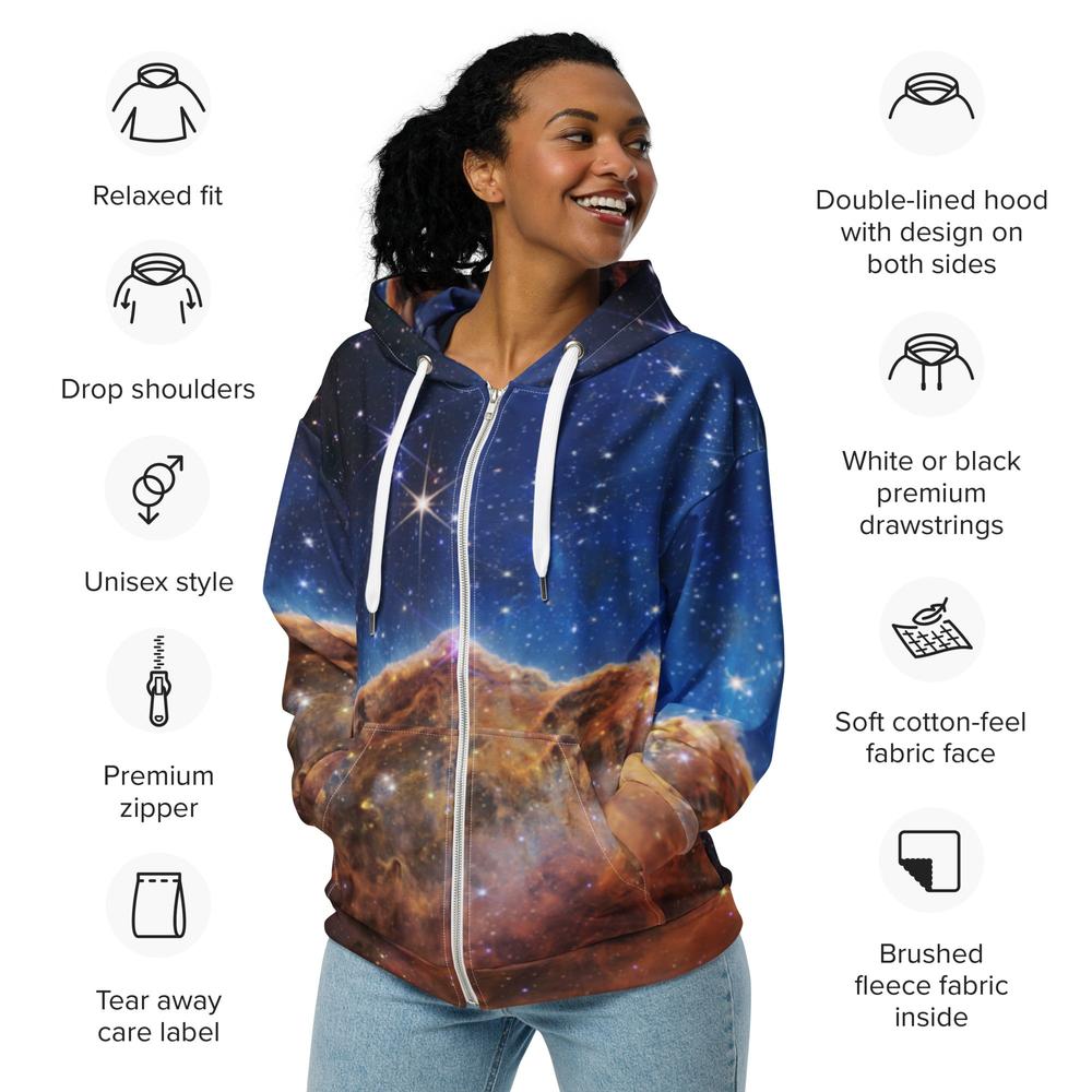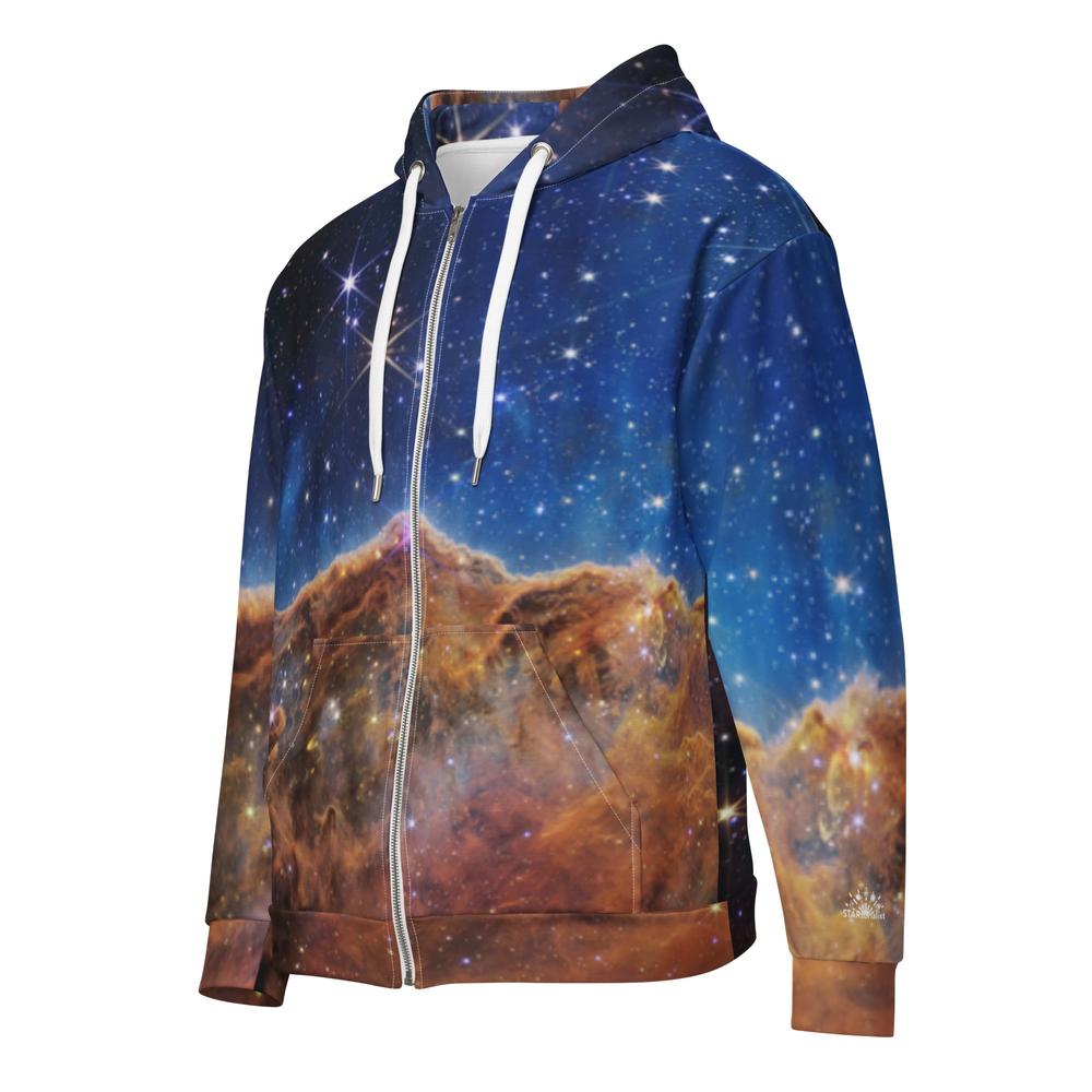 The Universe has brought you your favorite hoodie! With a vibrant real space image, full-length zipper, thick drawstring with metal ends, and front half-pouch pockets, this hoodie is out of this world. This is JWST's view of the "Cosmic Cliffs" of NGC 3324 in the Carina Nebula as imaged by NIRCam and MIRI at infrared wavelengths of light. The Carina Nebula is an immense star-forming region about 7,600 light-years from Earth in the Southern Hemisphere constellation of Carina.