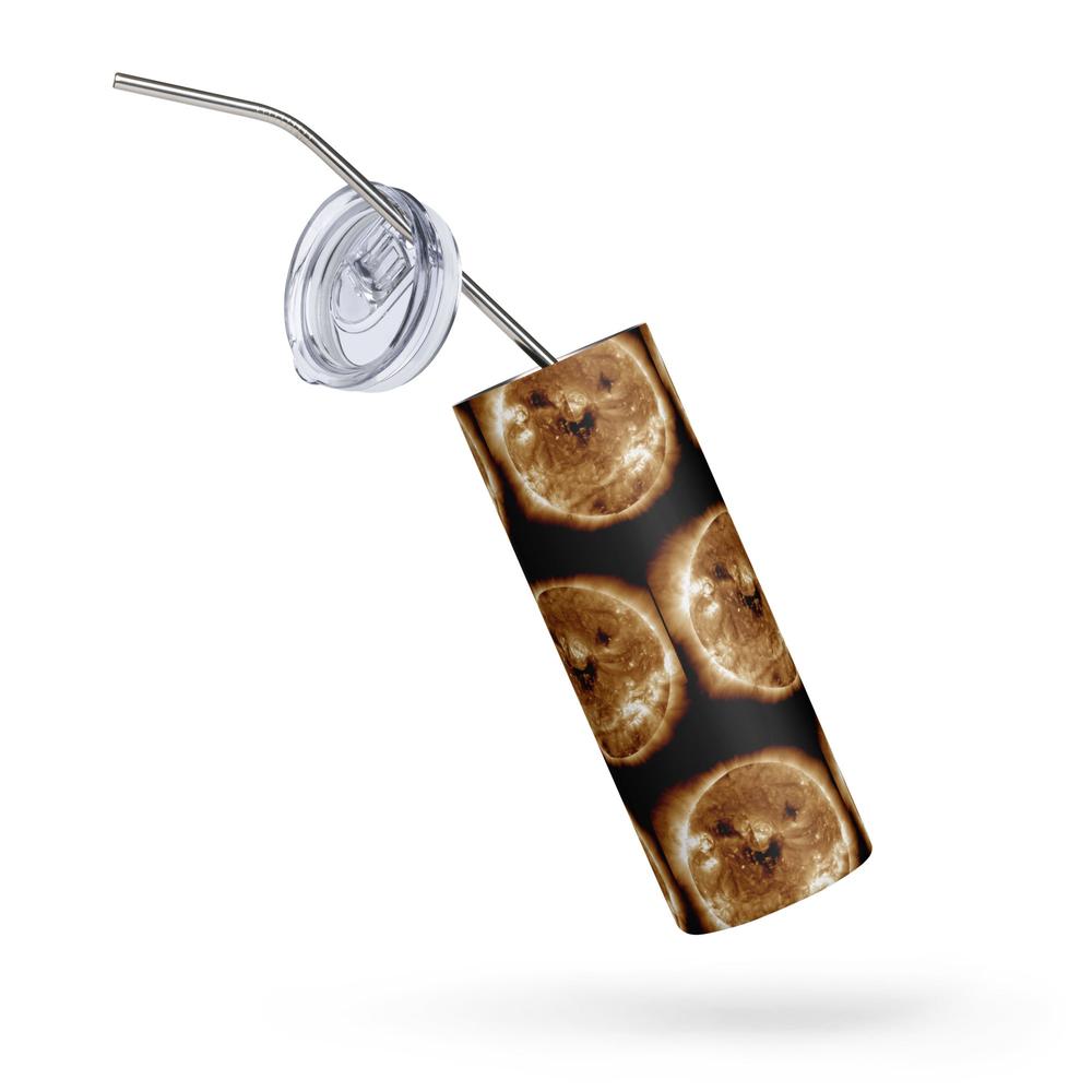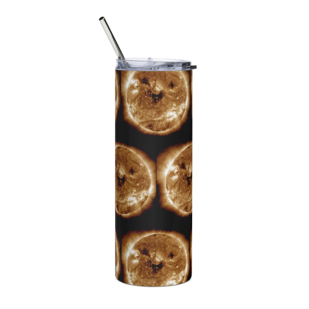 Sometimes you just need to drink in the Universe from a sustainable travel mug with an anthropomorphized Sun smiling back at you... As luck would have it, Margaret thought the same thing and requested a design featuring this serendipitous solar observation! In October 2022, NASA's Solar Dynamics Observatory (SDO) spotted Sun in ultraviolet light with a few dark patches, known as coronal holes, creating an unmistakable grin.