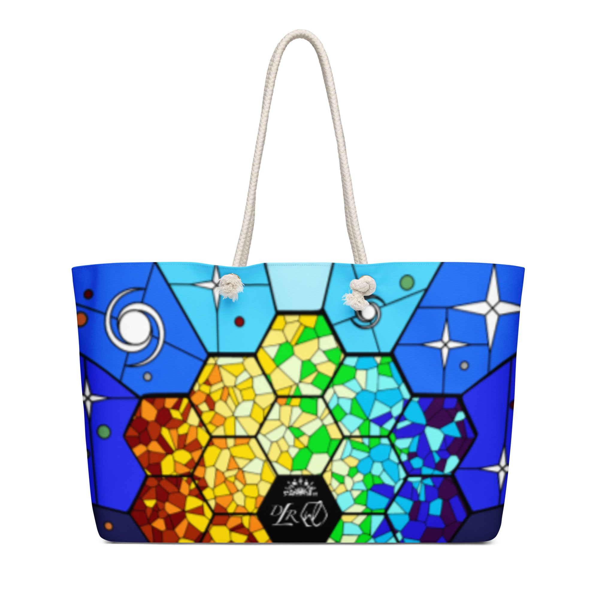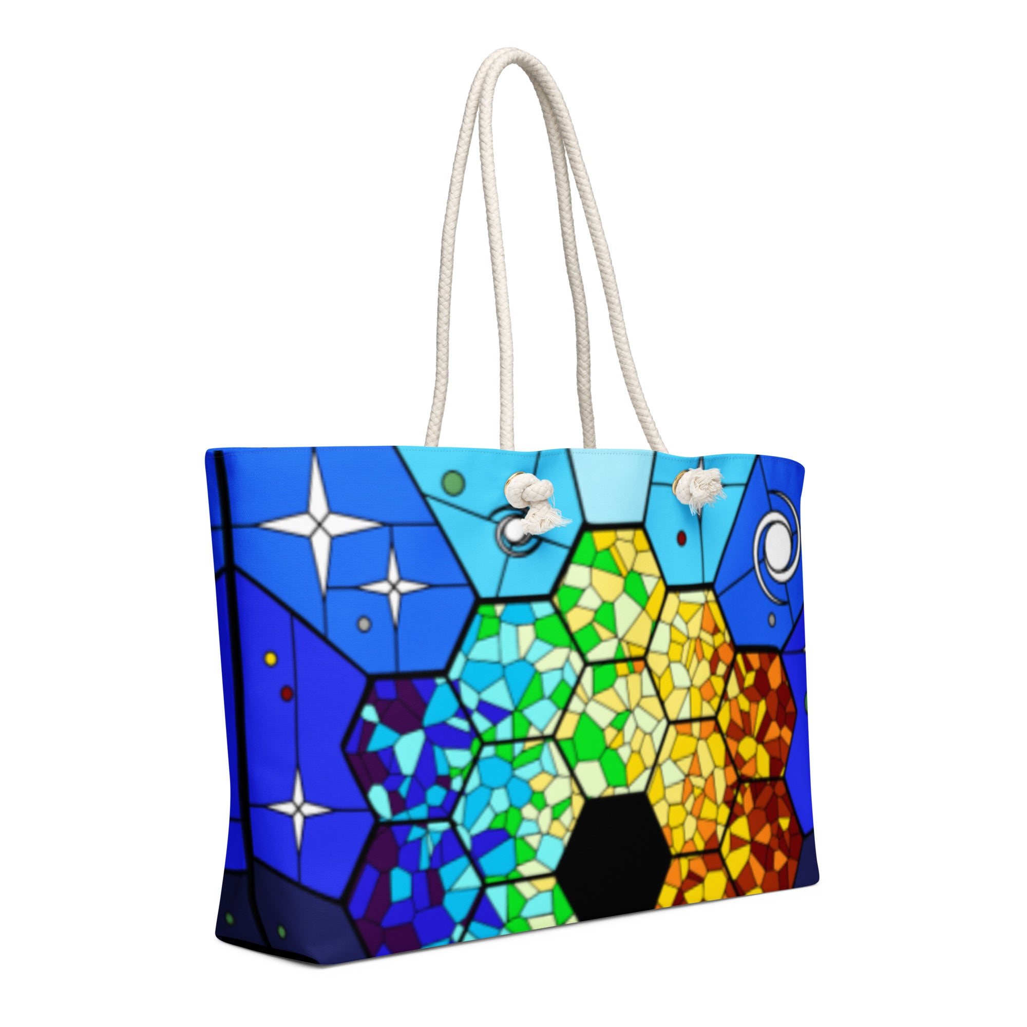 Celebrate the full spectrum of light that JWST has shed on the Universe, as well as the people behind it, with a vibrant and functional JWST Rising weekender bag. The design is based on a stained glass piece by astronomers David Law and Nora Luetzgendorf. Nora created the graphic design, including the rainbow tessellations filling the iconic JWST mirrors, and David made the original stained glass piece, which now hangs in the lobby of the Space Telescope Science Institute in Baltimore, Maryland, also the home of the JWST Mission Operations Center.