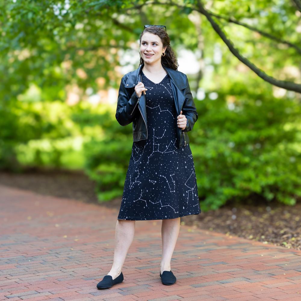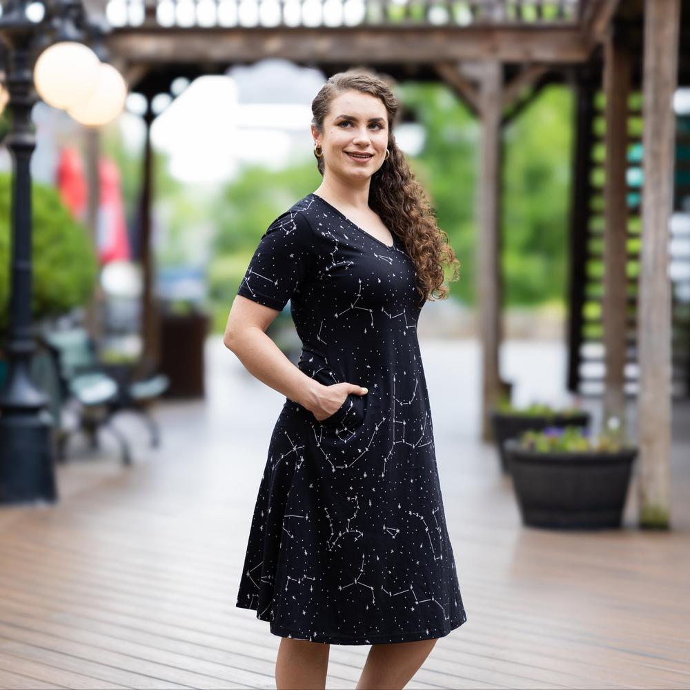The wondrous night sky has inspired generations of humans to imagine what they are and what lies beyond. This classic black V-neck, shot-sleeve dress features all-over-print stars and constellations that glow in the dark, plus functional pockets. The accurate constellations include: Lyra, Hercules, Boötes, Cygnus, Ursa Minor, Ursa Major, Cassiopeia, Cepheus, Draco, Canes Venatici, Aries, and Canis Minor.