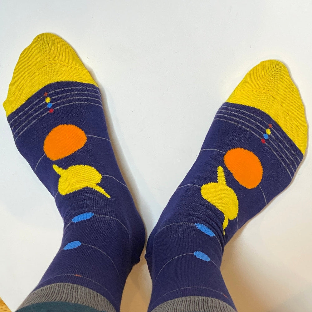 Head in the stars? Don't forget about your feet! These super soft socks sport the Solar System to scale in size and approximate distance (separately!) from the Sun to Pluto! Seamless toe and wide cuff for major comfort. Designed by an astronomer!